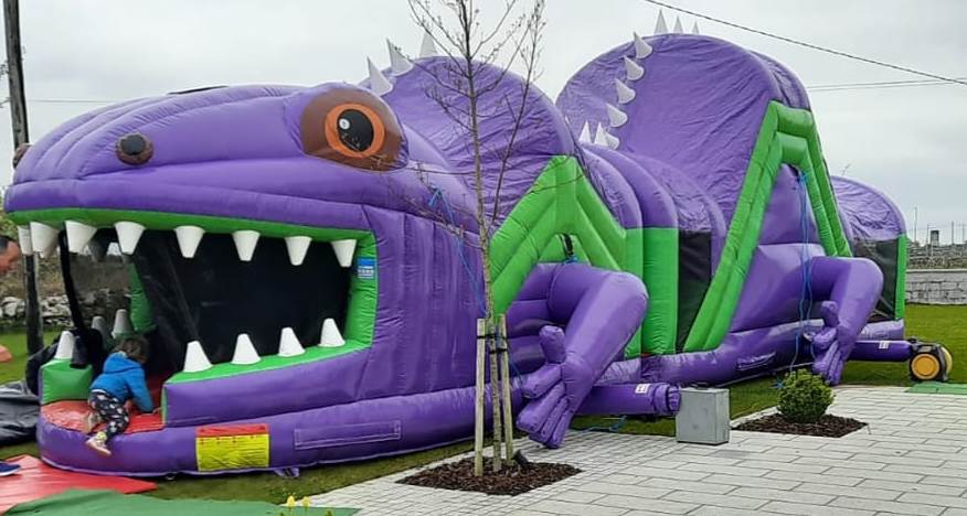 Entrance through the mouth where you are met with challenging obstacles, tunnels, and bouncing areas – then, the real excitement with the amazing 8.5ft Slide which is assisted with safety straps and stepping blocks. Fully Covered throughout – this promises to be a real party pleaser…!!!